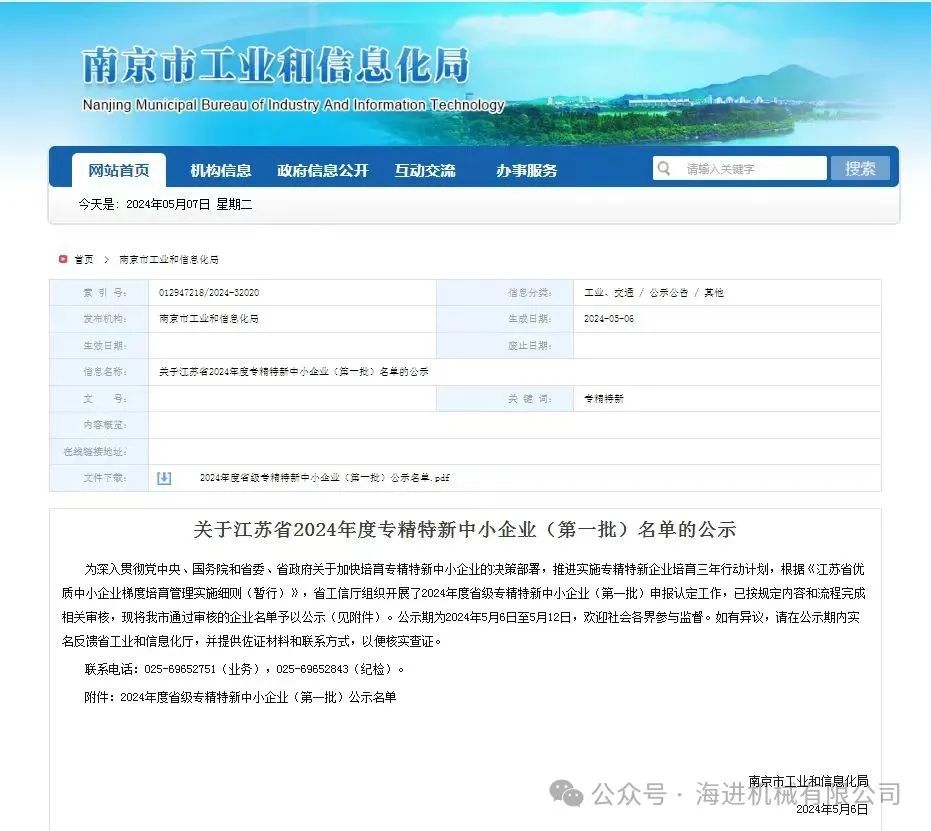 • 海進機械榮獲“2024年度省級專精特新中小企業”認證